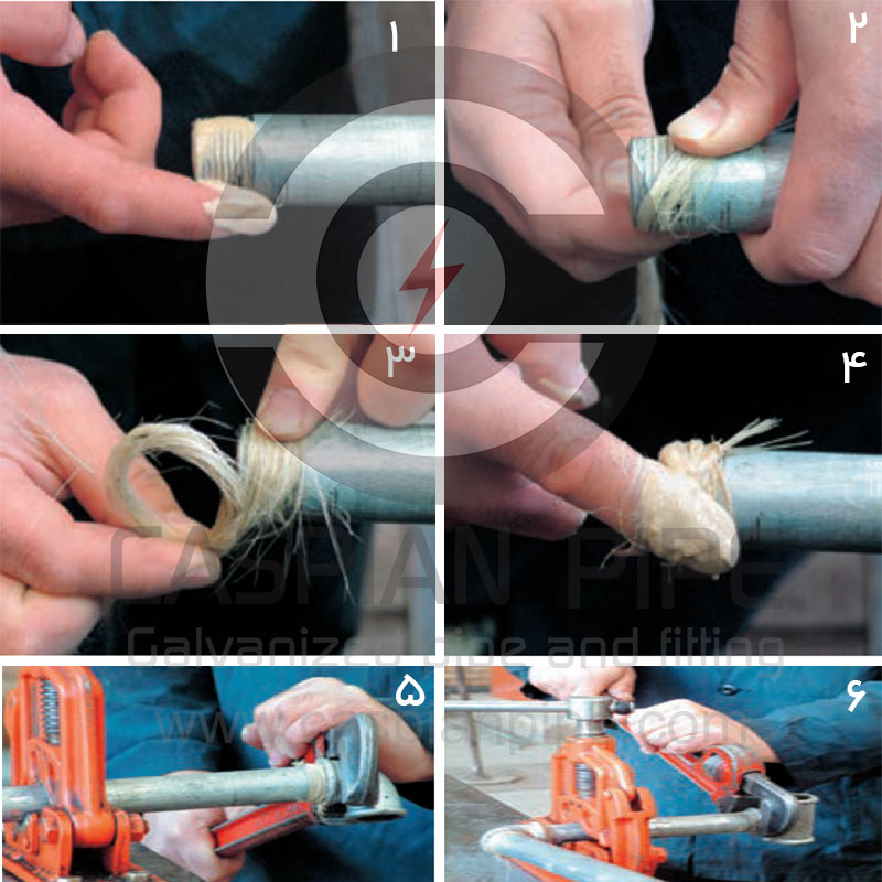 دستور العمل : ابتدا مقدار کمی خمیر بر روی سطح دنده ها بمالید کنف را به طول و قطر مناسب جدا کنید ، الیاف آن را باز نمایید و در جهت بسته شدن اتصال بر روی دنده ببندید.
